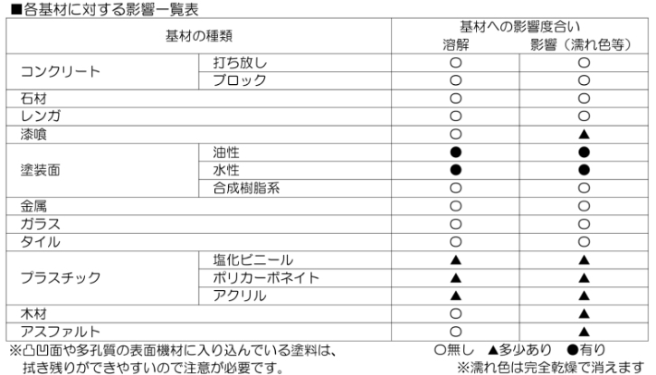 皮膚一次刺激性試験により「弱い刺激性」の評価を得ていますが、メガネ・手袋など保護具を使用してください。 本剤はエステル系工業用(強力型)の為、溶かす範囲が広くなっています。基板材料を溶かさないかの確認を行ってから使用してください。